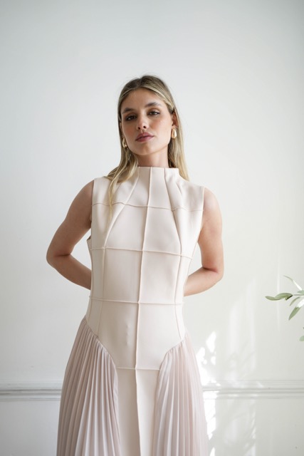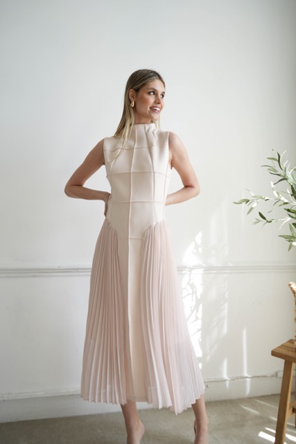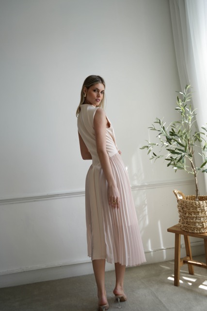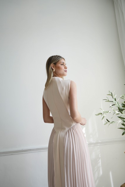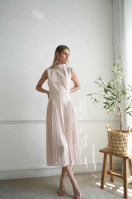 Expertly tailored to flatter the figure, designed with an hourglass silhouette and shaping geometrical stitching. This luxurious sleeveless midi dress features an elegant pleated detail from the waistline. A timeless nude hue gives a classic touch that will never go out of fashion.